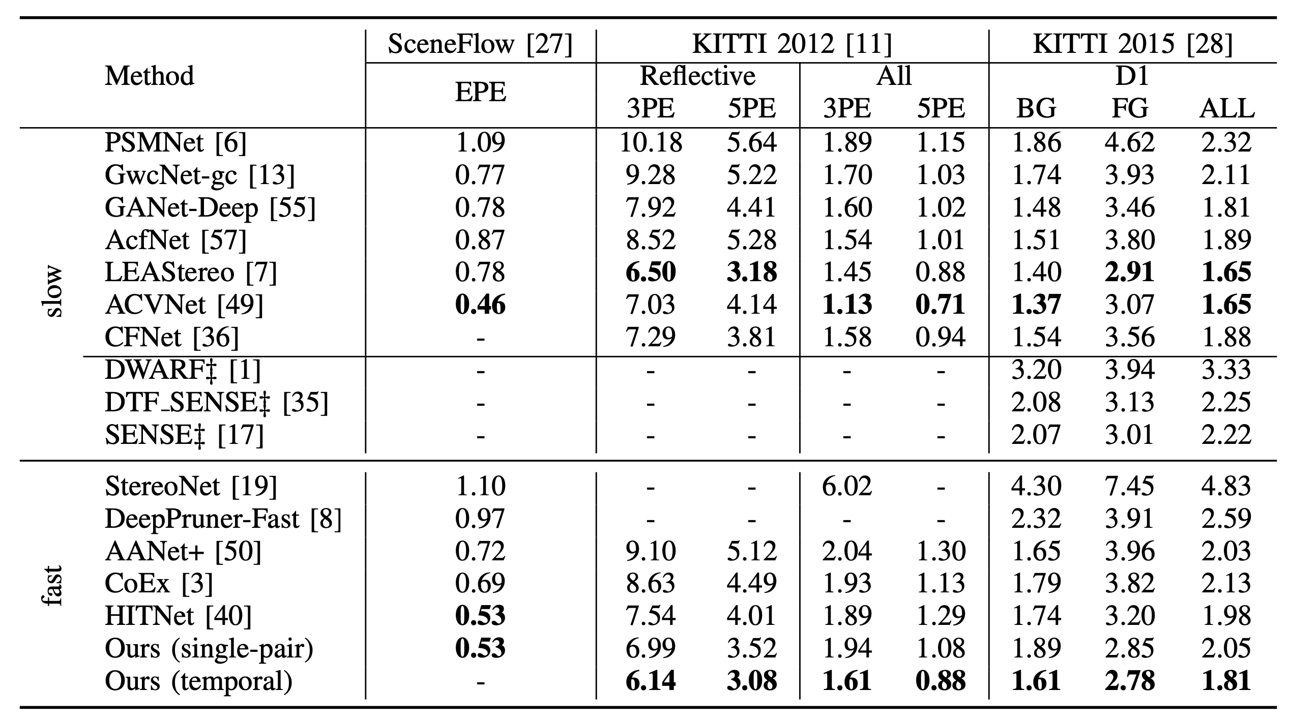 Even without access to the ground truth pose, our TemporalStereo in temporal mode is robust to dynamic objects (e.g., pedestrians).